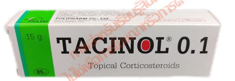 tacinol 0.1 TACINOL 0.02. เลขทะเบียน : 1A 275/42. รูปแบบจัดกลุ่ม : cream. รูปแบบตามทะเบียน ... cream 0.1% (5 g), 1 หลอด, 10. Triamcinolone acetonide, cream 0.1% (15 g), 1 ...